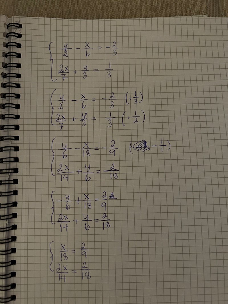 Hm menar du att jag ska hitta mgn för samtliga tal i ekvationerna? Jag trodde att man multiplicerar hela ekvationen med ett tal. Men ska jag multiplicera y/2 med 1/3, x/6 med 1/1 och -2/3 med 1/2?