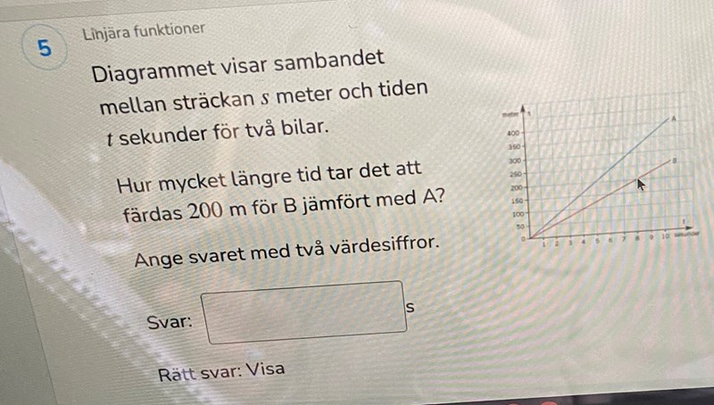 Det är ju egentligen sekunder man använder som enheter här, men ja det verker stämma att det tar 5 sekunder för A och 8 sekunder för B, och att skillnaden mellan de två är 3 sekunder. Problemet är att det ser ut som att det inte är exakt 5 och 8 sekunder, grafen verkar gå väldigt nära just de punkterna. Undrar om du behöver ta fram ekvationen för de två linjerna och räkna ut skillnaden på det sättet, om det inte är exakt 5 sekunder och 8 sekunder så kommer skillnaden inte heller vara exakt 3 sekunder utan det kommer att bli något decimaltal som är väldigt nära 3. Om man vet två punkter på en linje så kan man få fram dess ekvation.