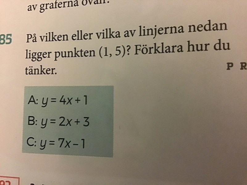 Du kan också prova att stoppa in X=1 i ekvationerna och se vad Y blir och jämföra med Y=5 som är givet i (1,5)