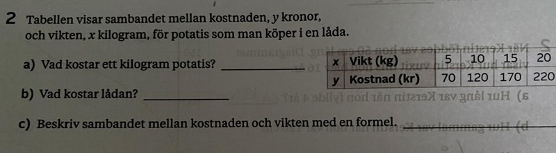 Hur mycket mer kostar det att köpa 10 kg jämfört med 5 kg? Så mycket kostar 5 kg potatis. När du vet det kan du räkna ut vad 1 kg potatis kostar.