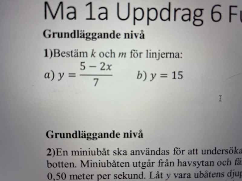 Bestäm k och m för linjerna: a)Y=5-2x /7 b) Y=15
