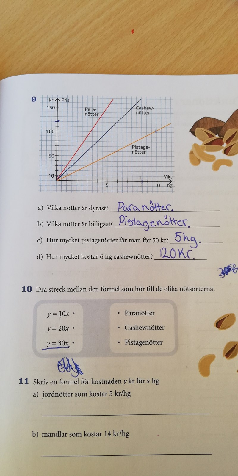 En graf visar kilopriset på chashewnötter, pistagenötter och paranötter. Nu ska jag dra ett streck mellan tre olika formlar, vilken som passar till vilken nöt.