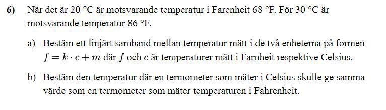 På uppgift a) fick jag fram att det linjära sambandet blev F=1,8*C+32 men vet inte hur jag ska börja på uppgift B? :)