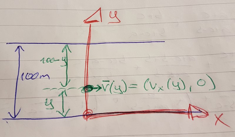 En flod, B, korsar den helt raka och 100 m breda floden A i sin eka. Använd ett ON-system där flodbädden på floden B startsida ligger längs x-axeln och positiva y-axeln är riktad rakt mot flodens andra sida. Floden A vatten har en flödeshastighet proportionell mot produkten av avstånden till flodbäddarna. Mitt i floden flyter vattnet med farten 0.50 m/s.