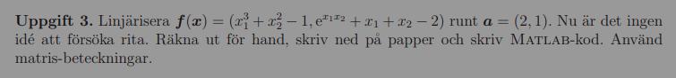L(x,y)=f(a,b)+f1(a,b)(x-a)+f2(y-b)L(x,y)=f(a,b)+f_{1}(a,b)(x-a)+f_{2}(y-b) Men detta förutser väl att  f:2f:\mathbb{R}^2 \rightarrow \mathbb{R}, men i vårat fall har vi f:22f:\mathbb{R}^2 \rightarrow \mathbb{R}^2 så vi kan inte använda oss utav formeln?