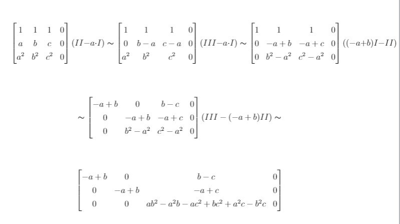Det låter som att du sällt upp en ekvation (dvs s*v1+t*v2=v3) men inte kunna reducera. Låt R1 beteckna rad 1 i denna, R2 rad 2 och R3 rad 3. Om du då tar R2-a*R1 och R3-a^2*R1, och sedan i den nya rad 3 utvecklar b^2-a^2 till (b+a)(b-a), borde du du inte kunna reducera genom att ta R3'-(a+b)*R2' där R3' och R2' är de nya raderna?