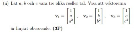 Vi har tyvärr inte kommit tillräckligt långt för att kunna använda sånt ;/. Vi har endast lärt oss om linjärt oberoende/beroende ifall det vektorerna är multiplar av varandra, har endast trivial lösningen eller om de innehåller nollvektorn.
