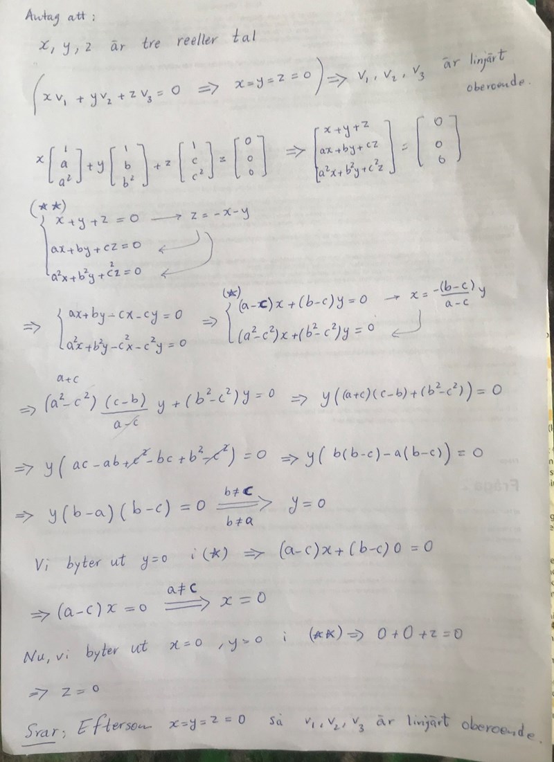 Hur är det menat att man ska lösa den här uppgiften? Själv tänkte jag att jag kunde lösa homogena matrisekvationen och se ifall det finns några andra lösningar än den triviala, men det blir väldigt svårt att reducera totalmatrisen hela vägen. Några tips?