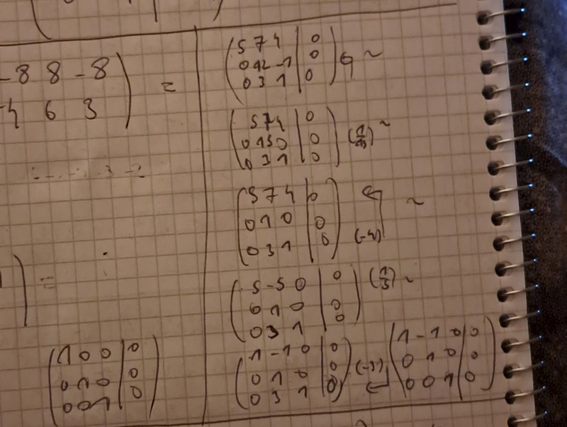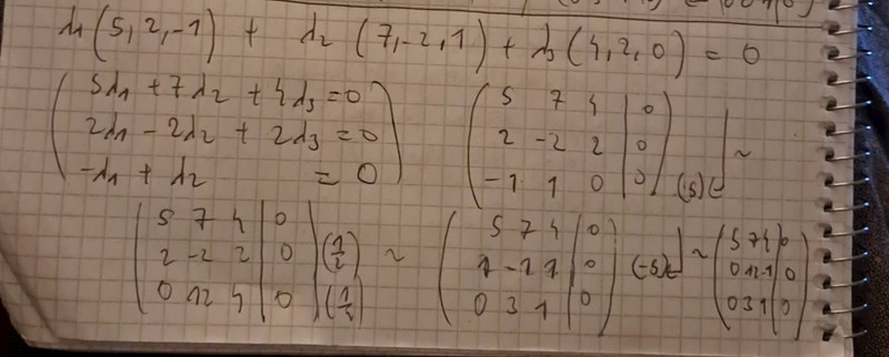 Oj det är sant. Lambda1=lambda2=lambda3 blir ju lika med 0 när jag får ettor på diagonalen. Det betyder att en av vektorerna kan skrivas som linjär kombination av de övriga två vilket betyder atr vektorerna är linjärt beroende. Annars är de linjärt oberoende. Vi fick ju lambda=0 och då är de linjärt oberoende