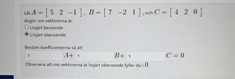 Hondel skrev:Nej, tvärtom. Den enda lösningen är att alla lambda är 0, så det enda sättet du kan kombinera ihop vektorerna så att resultatet blir 0 är om du multiplicerar med 0. Det betyder att du inte kan skriva någon av vektorerna som en kombination av de andra. De är därför linjärt oberoende.