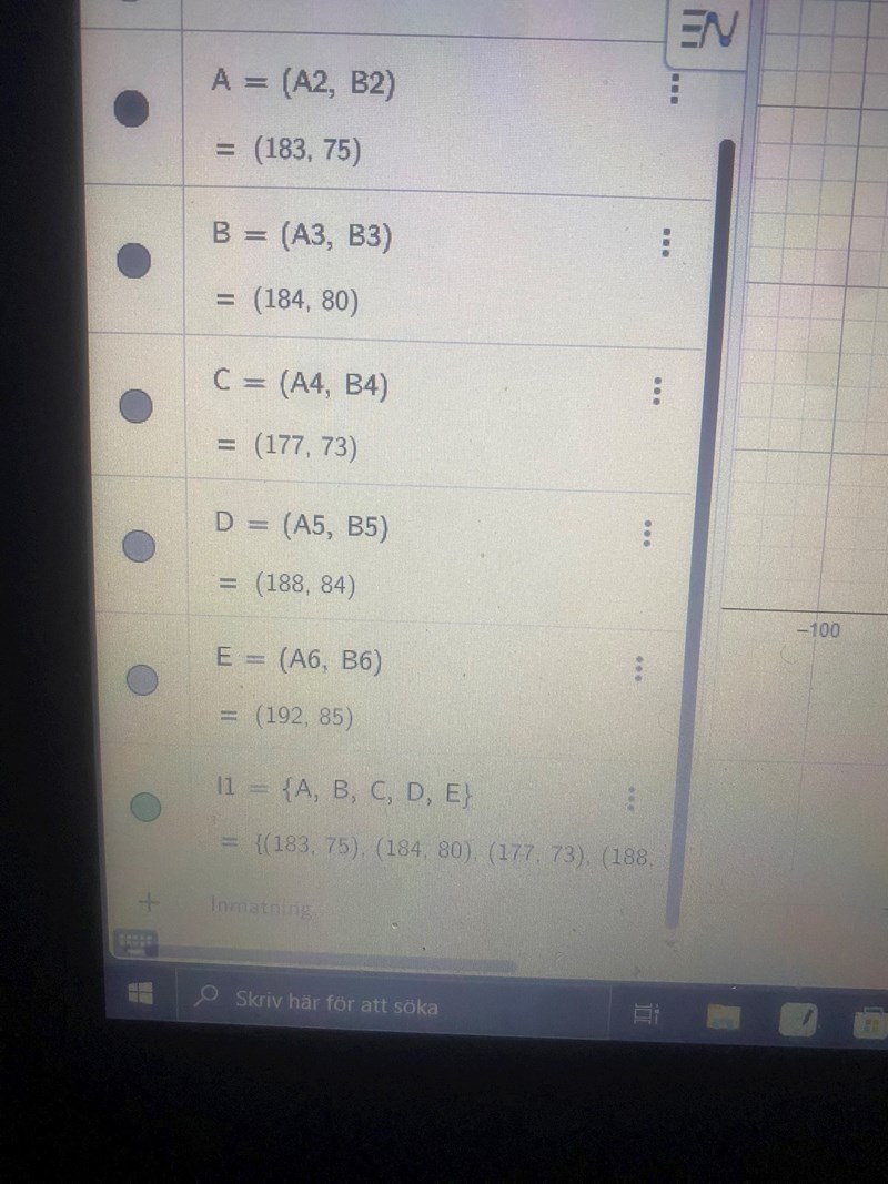 Men om sambandet du vill finna är vikt y som funktion av längd x, dvs y = kx+m, så ska du istället beräkna k = (skillnad i vikt)/(skillnad i längd), dvs .
