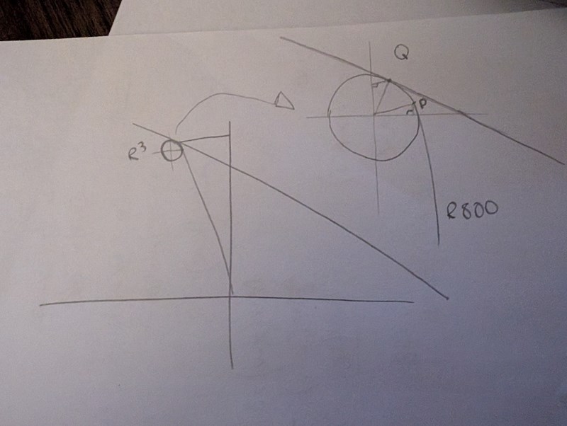 Det jag skrivit ut är informationen att tillgå. Cirkeln R3 är tangent till linjen 15° och radien 800. Man vill hitta koordinaterna för dessa punkter i y och x. Vet inte hur man ska tänka med R800 där