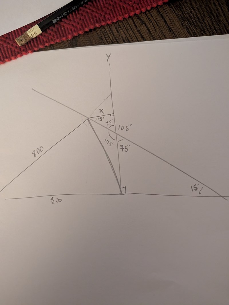 Nej, jag ser. "Tangenttriangeln" som konstrueras där har vinkeln 15° ovanför x där, vilket medför att man kan göra en rätvinklig triangel med kateten 800 och vinkel 15° pga likformighet. Sedan kan man räkna ut hypotenusan på den och ta det avståndet-800 så har man hypotenusan på den översta lilla triangeln där.