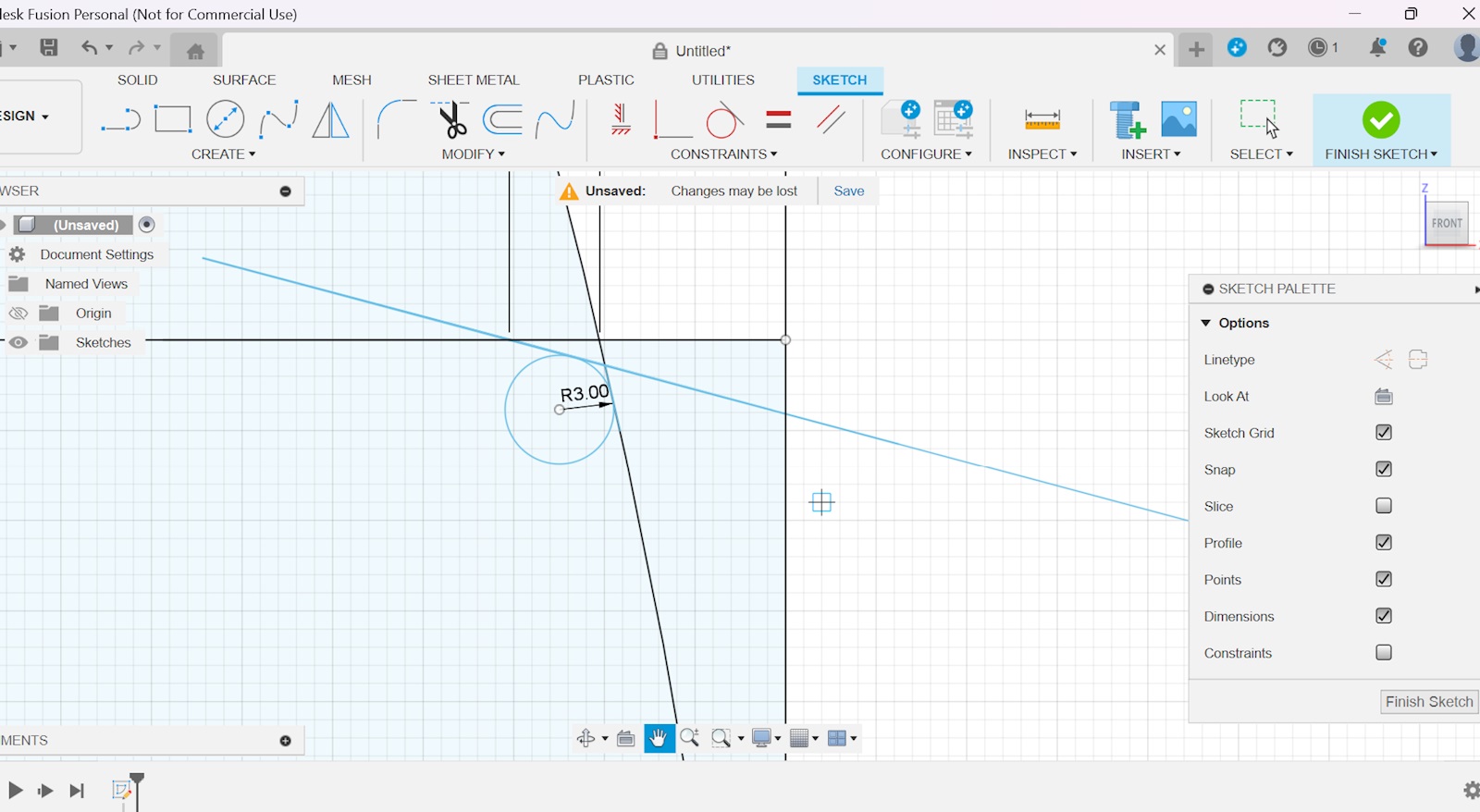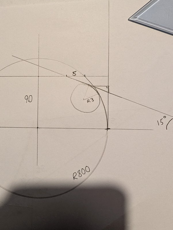 Egentligen ska det vara en liten cirkel R3 tangent till både linjen 15° och R800 på insidan vid vinkel D och vinkeln ovanför D där, precis i hörnet vid skärningspunkten. Det kunde lösas ändå så hoppade över det här, och för att det kändes väldigt komplicerat.