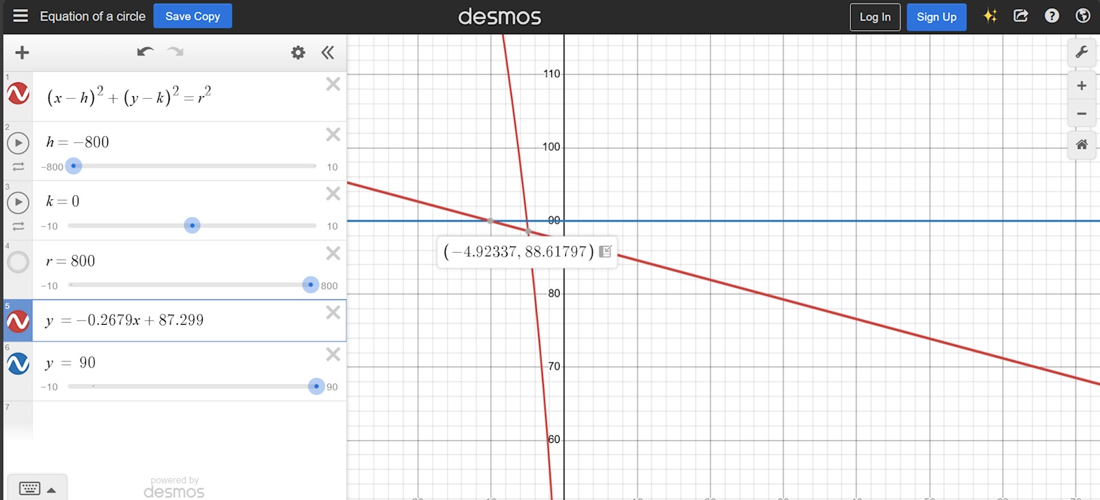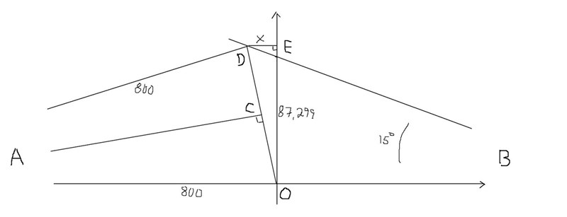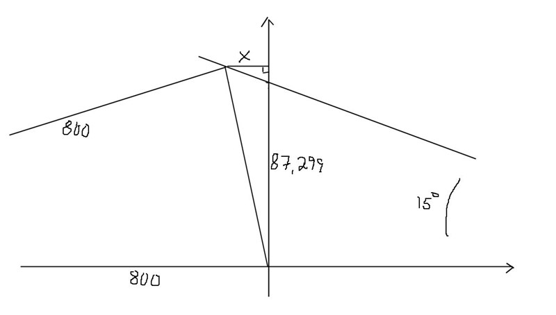Jag har ställt upp ekvationen sqrt((X^2 +(-tan(15)x+87.299)^2) = 800^2