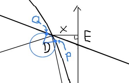Men Jag tror att punkt D skulle vara en tangent till den cirkeln (eller snarare vinkeln därifrån), så har man den vinkeln D där och faktumet att det är 90° till cirkelns centrum borde man bara kunna rita upp en liten triangel där och navigera sig ifrån X koordinaten till skärningspunkten. Eller så är det mer komplicerat.