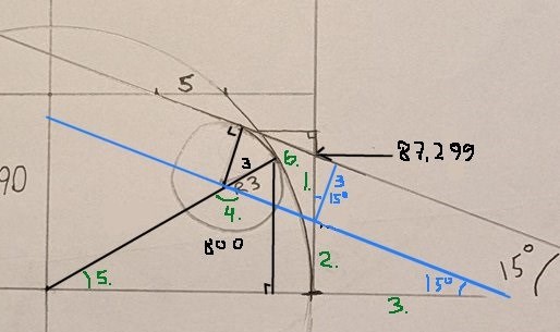 Förstår inte riktigt. Cirkel R3 är tangent till R800 och linjen 15°, detta bildar två stycken punkter på respektive tangeringspunkt. Det som är intressant är avståndet ifrån origo till dessa två olika punkter för y,x respektive. Intressant är väl också vart på cirkel R3 R800 tangerar och vilken vinkel en tangent linje skulle ha där.