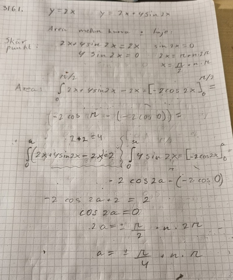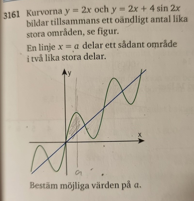 Smaragdalena skrev:Kan det vara så att du bara har räknat på när "den krångliga kurvan" ligger ovanför linjen, och facit har räknat på båda varianterna?