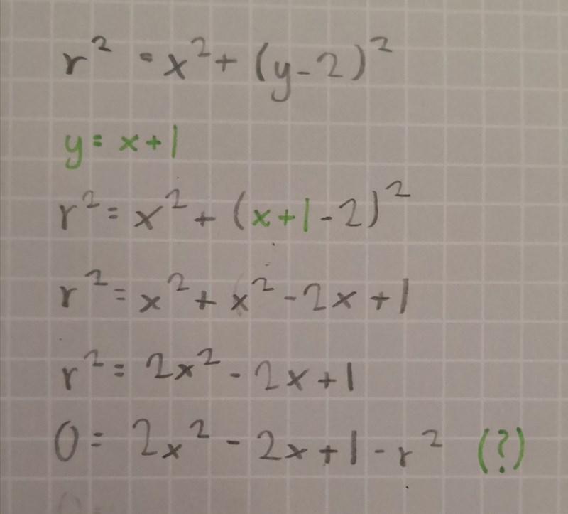 Hej, kan någon hjälpa mig här? Tänkte först använda pq-formen för att beräkna x men vet inte vad jag ska göra när jag ej har nåt värde på VL utan bara r^2. Kolla mina anteckningar för klargörande