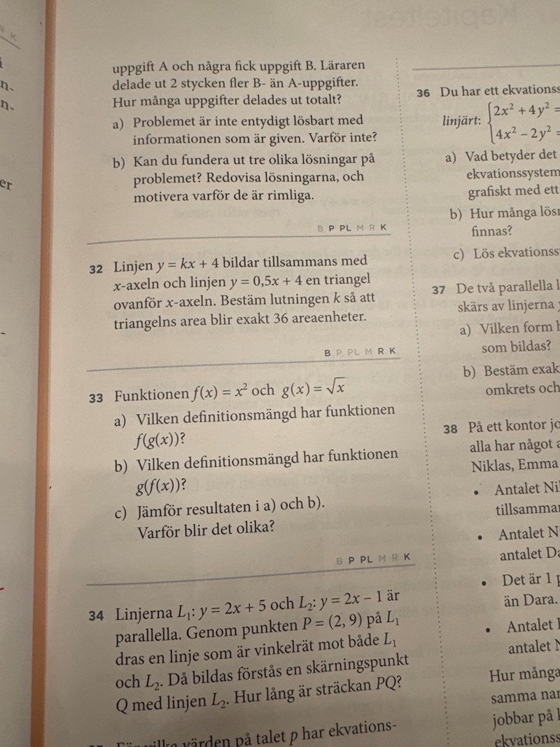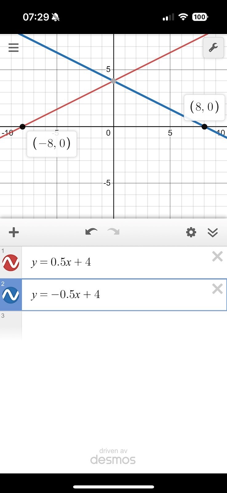 Nej, du behöver inte Desmos, men det underlättar för förståelsen och den fortsatta problemösningen om du för hand ritar ett koordinatsystem, linjen y = 0,5x+4 och att du ritar ytterligare en linje med annan lutning som även den går genom punkten (0, 4). Denna sista linje kallar du y = kx+4.