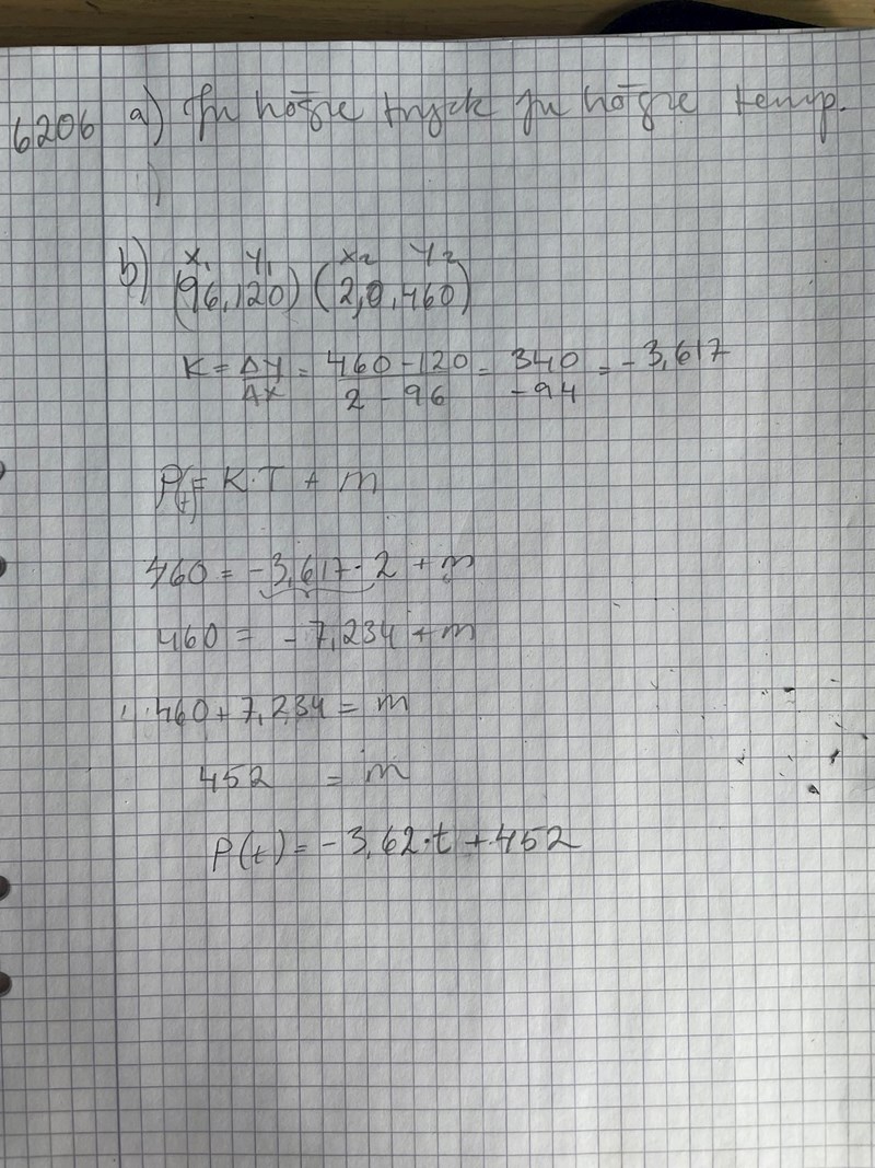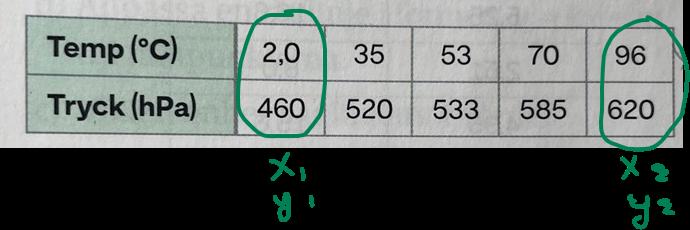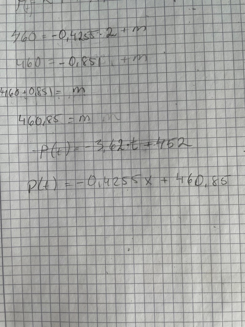 #4 och #7, då är det alltså så att numreringen på punkterna blir från vänster till höger, dvs (x1, y1) och (x2, Y2) som ger 460-620/2-96=1,7 ger ekvationen P(t)=1,7X+459,5