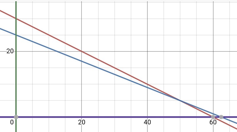 Om vi istälöet vill göra på samma sätt även här och sätta två ekvationer lika med varandra så kan vi skriva om den linjens ekvation y = 25-0,4x som x = 25/0,4-y/0,4.