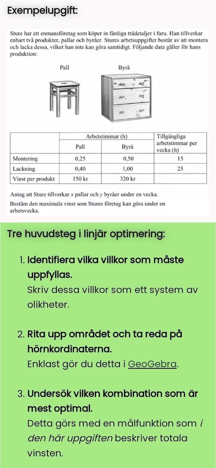 Kikat igenom NP för matte 3 b och där ska man kunna lösa linjär optimering i Geogebra men har inte jobbat i den då jag läser på distans själv, vilket jag iofs kunde men har inte gjort det nu, så behöver lösa denna algebraiskt. Och med det så behöver jag få hjälp med hur man kommer fram till hörnkoordinaterna algebraiskt när man räknat ut olikheter/villkoren och där dessa sammanfäller i ett o samma område. Uitfrån dessa hörnkoordinater får man ut största o minsta värde genom målfunktionen.
