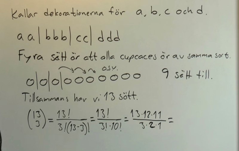 Anna000 skrev:Linn bakar tio cupcakes som kan dekoreras på fyra olika sätt.