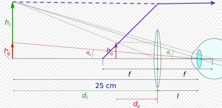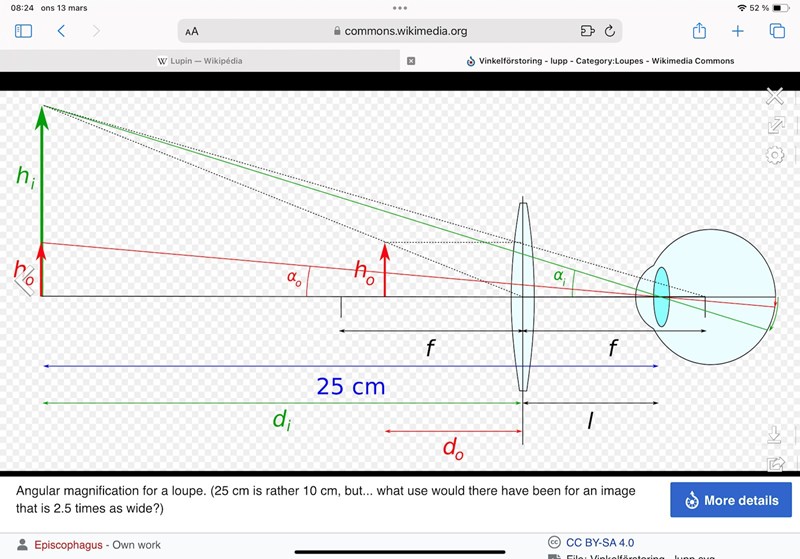Sedan finns det tveksamheter när figuren inkluderar ögat. För vinkelförstoringen är det kanske bättre att jämföra med vinkeln av strålen genom linsens centrum.