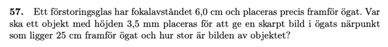 I lösningen till denna uppgift menar man att bilden är 25 cm framför linsen och att det därför gäller att s'=-25. Jag förstår att det enligt konventionen gäller att avståndet mellan lins och bild blir negativ om bilden är på samma sida som inkommande ljusstråles sida av linsen, men jag förstår inte hur man utifrån uppgiften kan dra slutsatsen att bilden ligger framför linsen. Förstoringsglaset ligger ju precis framför linsen, hur kan bilden då vara -25 cm (alltså bakom huvudet?)? Jag tänkte först att s'=25 och att bilden placerades 25 framför linsen och.