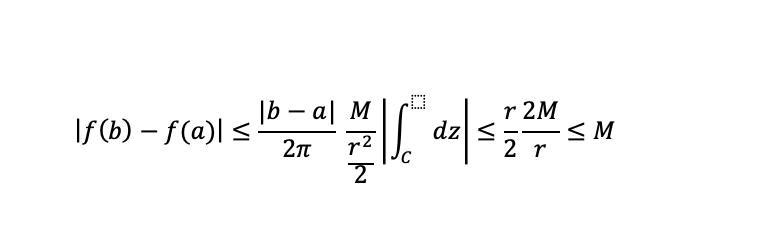 Hej! Jag försöker bevisa Liouvilles sats som säger att om en funktion är hel i hela komplexa talplanet och begränsad i samma område, är funktionen konstant. Det som jag har gjort är att jag har börjat med att välja två punkter a och b som tillhör komplexa talplanet och jag har en cirkel C. r är radien i cirkeln och antar att a är medelpunkten. Sedan har jag ritat cirkeln på följande sätt