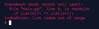 Index out of range betyder att du försöker accessa ett element i listan som inte finns, som har ett för stort index. Vad kan n+1 tänkas vara i det här läget?