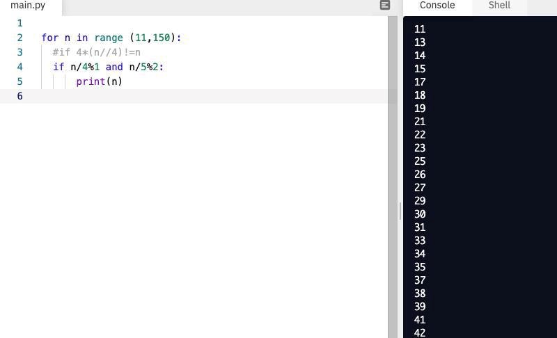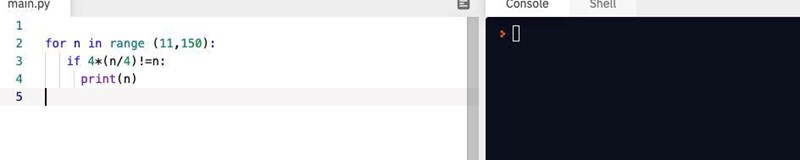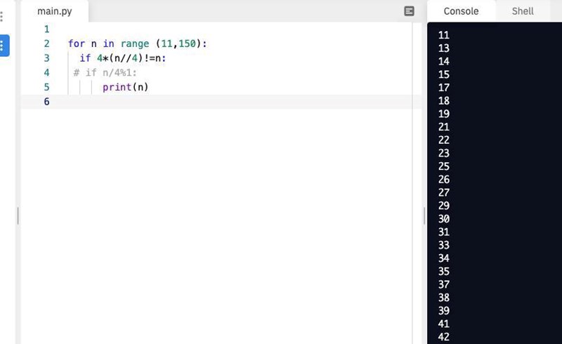 Vill nu skriva ett villkor, att endast de tal som delas på fyra och får ett heltal över skrivs ut. Förstår inte hur jag ska skriva det? Tänkte att jag kunde göra en if-sats: