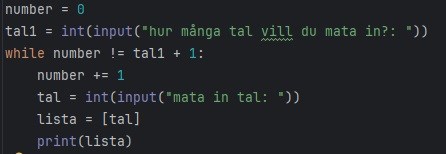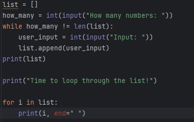 Såhär lyder uppgiften: gör ett program som först frågar efter hur många tal du vill mata in och sedan låter dig mata in dessa ett efter ett och lägga till dem i en lista. Låt slutligen programmet loopa igenom de inmatade talen och skriva ut dem.