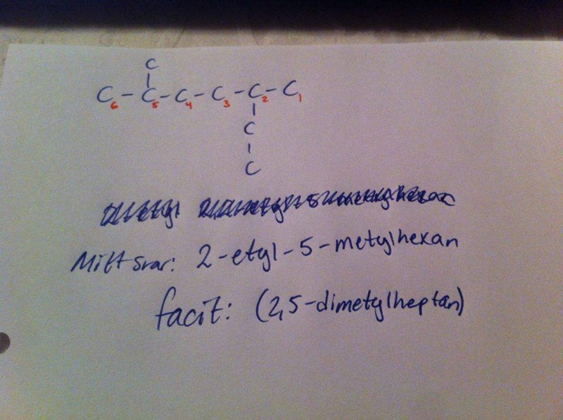 smaragdalena skrev :Den längsta kolkedjan startar med den kolatom du kallar 6 och slutar med kolatomen längst ner. Den är 7 kol lång, och har två metylgrupper på sig: en på kol nr 2(som du kallar 5) och en på kol nummer 5 (som du kallar 2).