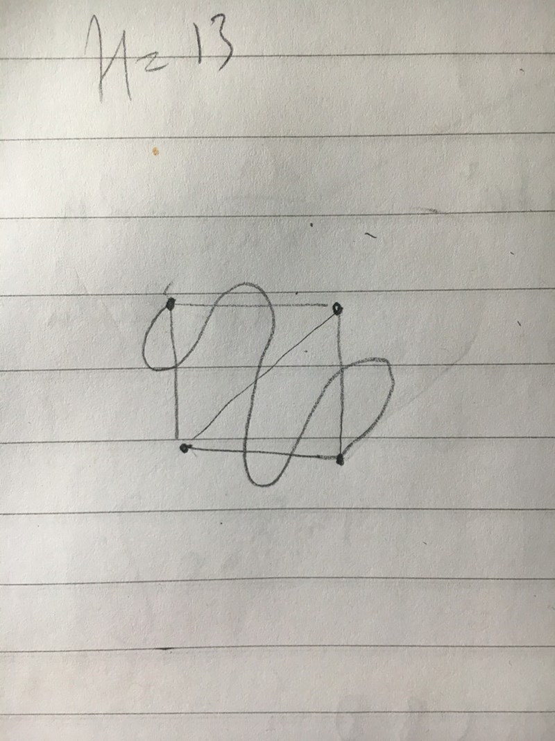 Boken tar den nedre grafen som exempel på en icke-plan sammanhängande graf eftersom två kanter korsar varandra i mitten där. Jag förstår att det blir konstigt när man ska börja räkna ytor sen och att det är därför formeln inte funkar då, men om man bara makar på en av kanterna som jag har gjort i grafen ovanför så blir det ju en plan sammanhängande graf som formeln fungerar på, trots att det är precis samma graf. Dåligt exempel tycker jag.