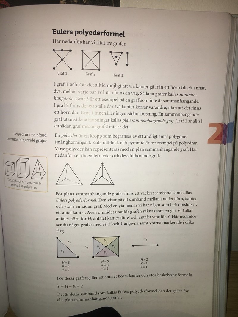 Hej, i delkapitlet om Eulers polyederformel vill boken göra en distinktion mellan "plan sammanhängande graf" och "sammanhängande graf" för att förklara att polyederformeln endast funkar för plana sammanhängande grafer.