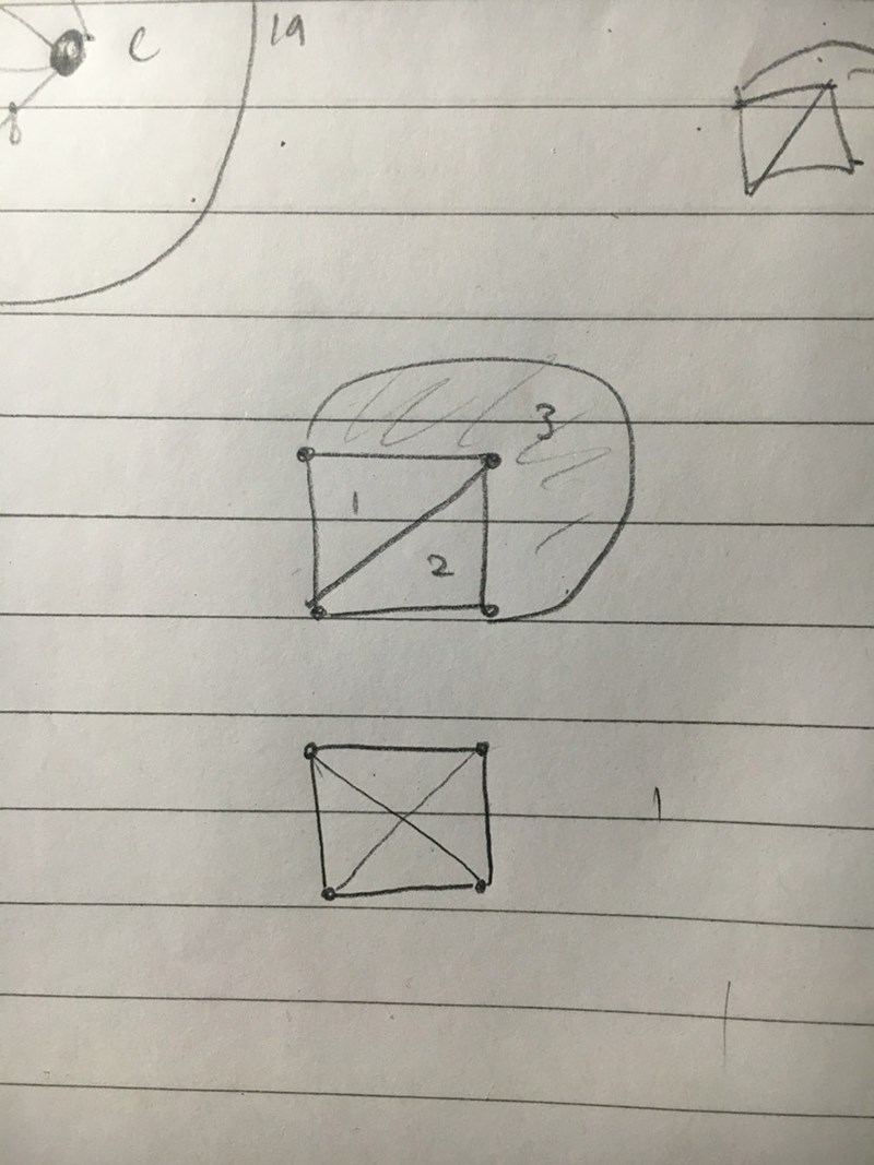 Boken tar den nedre grafen som exempel på en icke-plan sammanhängande graf eftersom två kanter korsar varandra i mitten där. Jag förstår att det blir konstigt när man ska börja räkna ytor sen och att det är därför formeln inte funkar då, men om man bara makar på en av kanterna som jag har gjort i grafen ovanför så blir det ju en plan sammanhängande graf som formeln fungerar på, trots att det är precis samma graf. Dåligt exempel tycker jag.