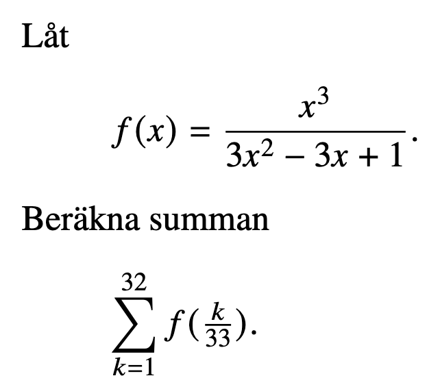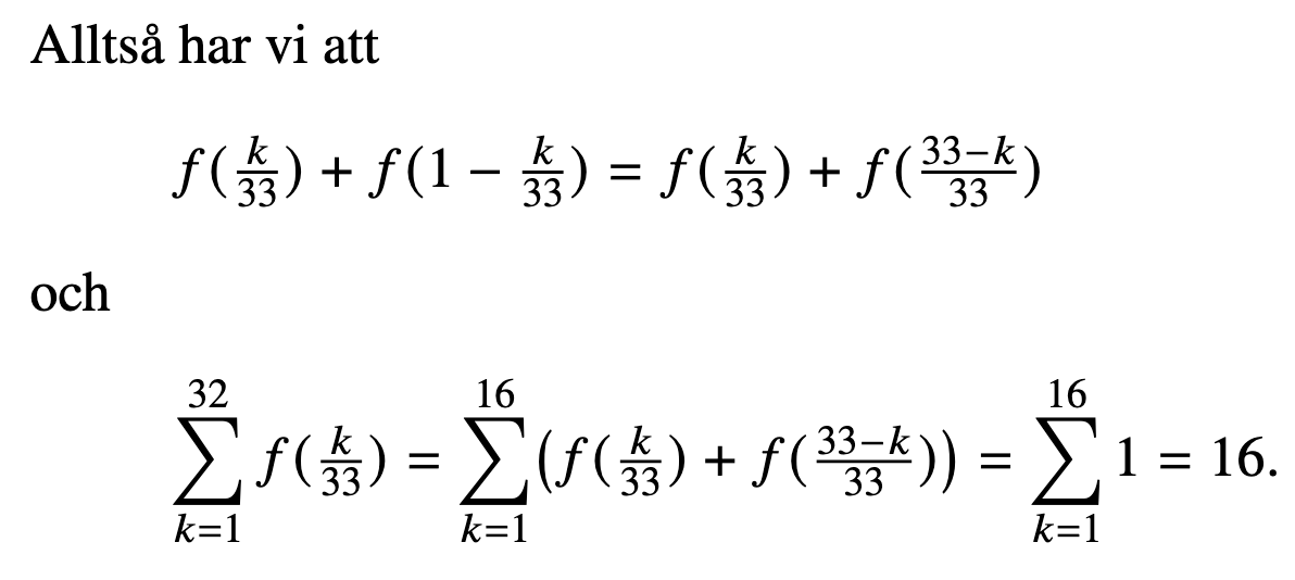 PS: För slutet blev jag påmind om den kända historien om en lösning till (sagt att Gauss kom på detta som mycket ung?) där man dubblerar summan och byter riktning för att summera ihop alla termer till . Roligt sätt att tänka!