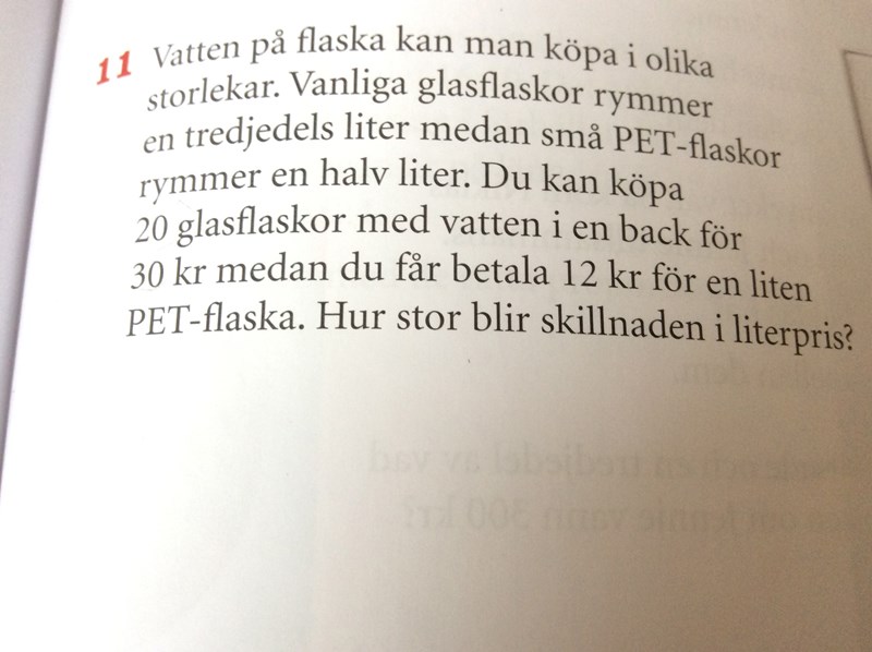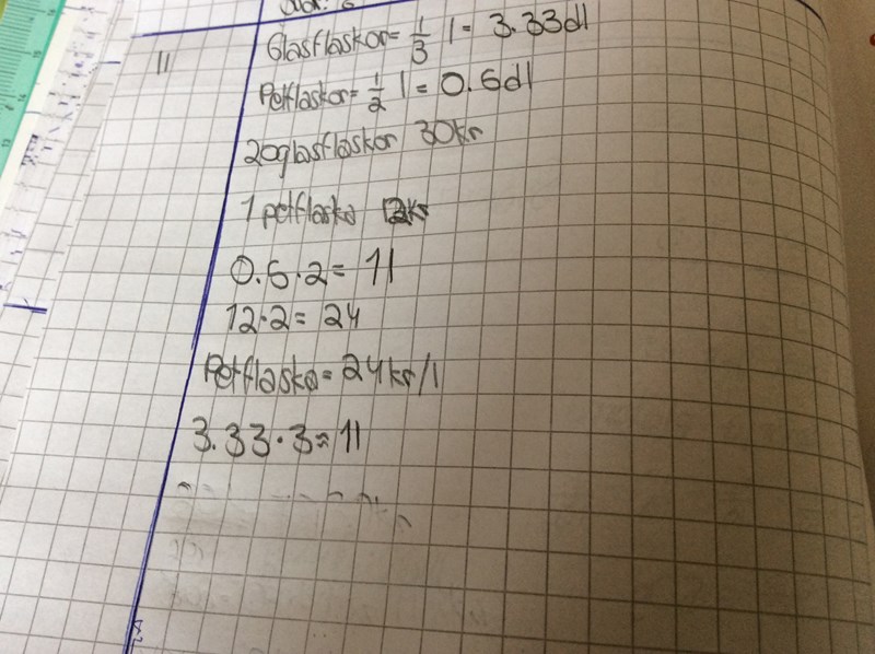 Min uträkning (jag fastnade där jag skulle räkna ut literpriset på glasflaskorna med vatten)