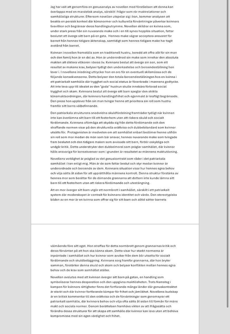 Hej! Jag har skrivit denna novellanalys utifrån ett genusperspektiv. Jag undrar om novellen är på A nivå och om inte, vad ska jag ändra på? Detta gäller för svenska 3.