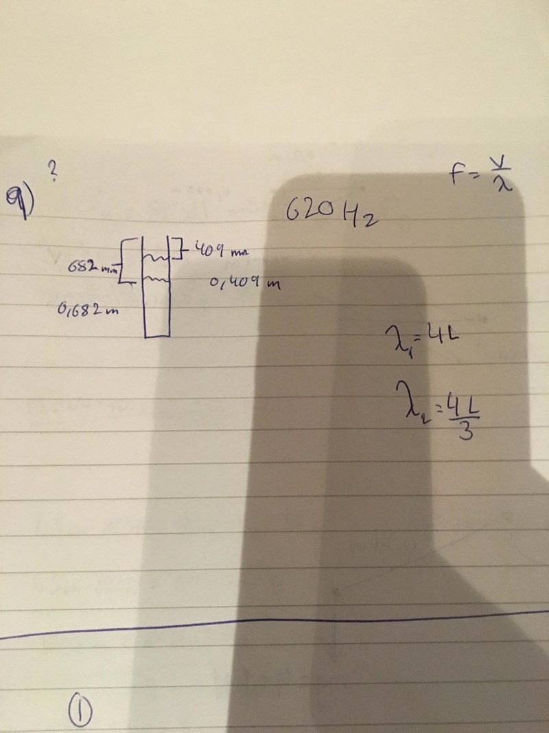 "Ett vertikalt rör är fyllt med vatten. Över mynningen hålls en liten högtalare som sänder ut en ton med frekvensen 620 HZ. När vattenytan inne i röret sänks uppstår vid vissa lägen resonans i luftpelaren ovan vattenytan. Ett läge då resonans uppstår får vi då vattenytan står 409 mm unde rrörets kant och nästa när vattenytan står 682 mm under kanten.