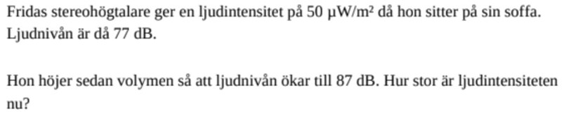 på facit ska svaret bli 500W/m2Ja, 10 dB högre intensitet är 10 gånger större intensitet (och 20 dB är 100 gånger större intensitet).