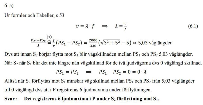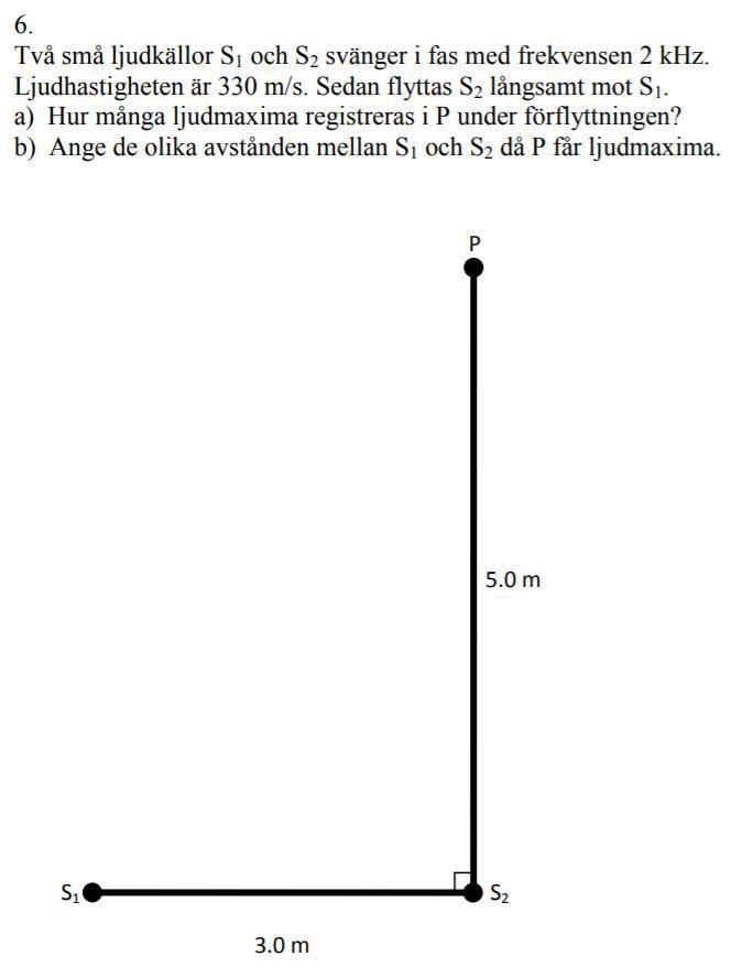 Är du med på att det är ett ljudmaximum varje gång som vägskillnaden är ett helt antal våglängder? Detta innebär att det är maximum när vägskillnaden är 5, 4, 3, 2, 1 och 0 våglängder, d v s 6 gånger.