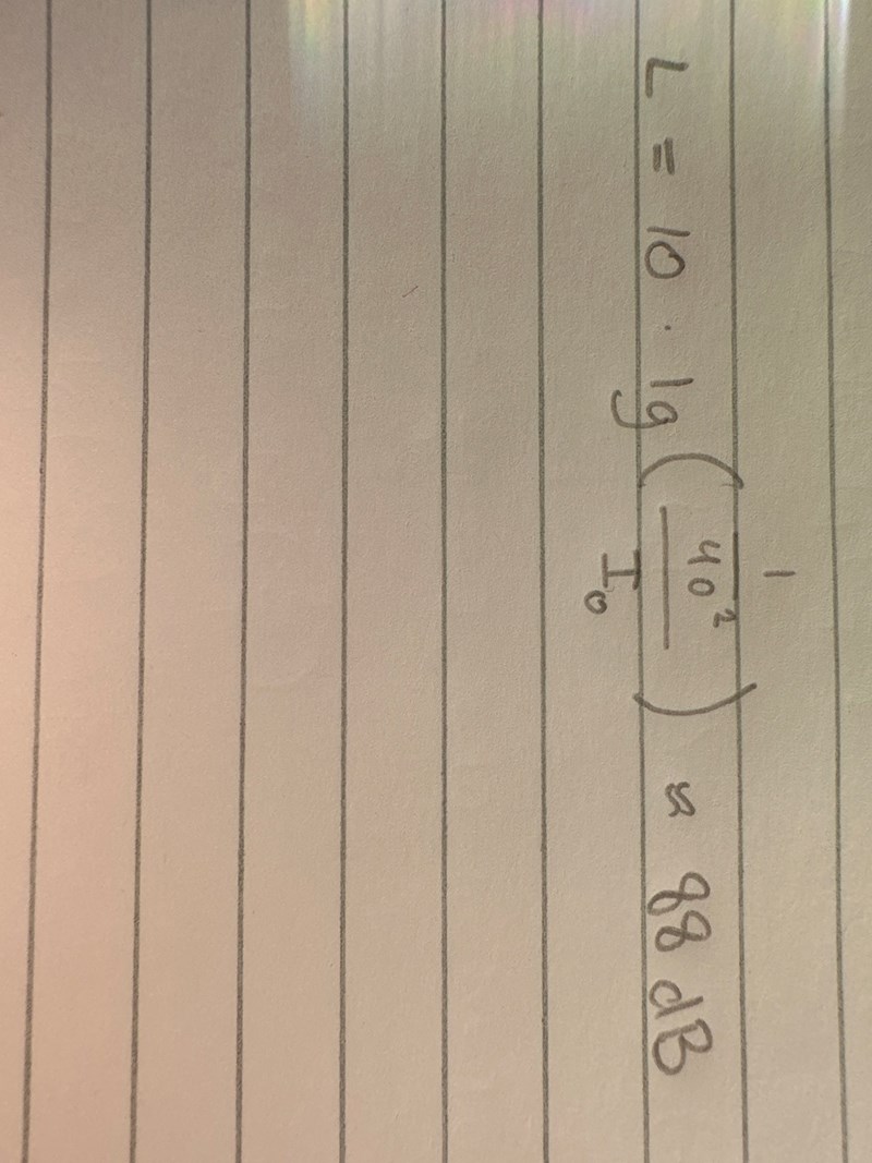 Varför blir det fel att göra som jag gjort? Jag tänkte att eftersom avståndet ökar med 40 meter kommer ljudintensiteten minska med radien i kvadrat (40^2) men jag får fel svar.