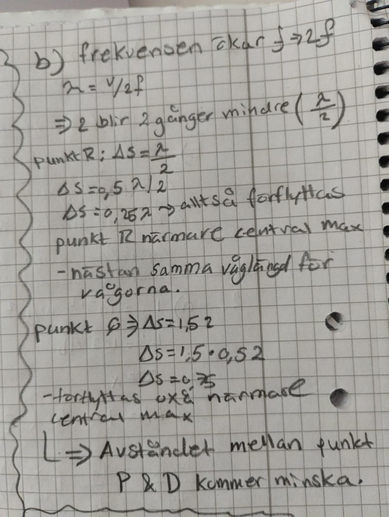 Två högtalare avger en ton med frekvensen 1060 Hz enligt figuren nedan. Peter går från punkt P rakt mellan högtalarna rakt uppåt. I punkten R bli oljudet svagare och sen blir det starkare igen innan det åter blir svagt i punkt Q.