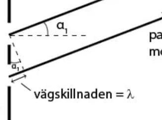 Jag har markerat några färgpunkter längs varje infallande ljud. Är du med på att avstånden från ljudkällan till två punkter med samma färg är lika? Fråga annars.