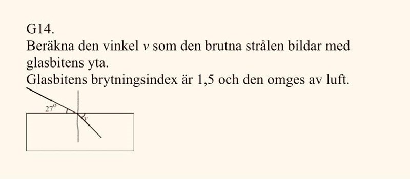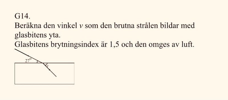 Beräkna den vinkel v som den brutna strålen bildar med glasbitens yta. Glasbitens brytningsindex är 1,5 och den omges av luft.