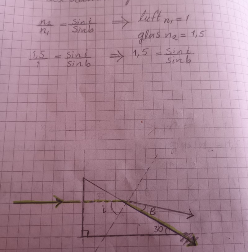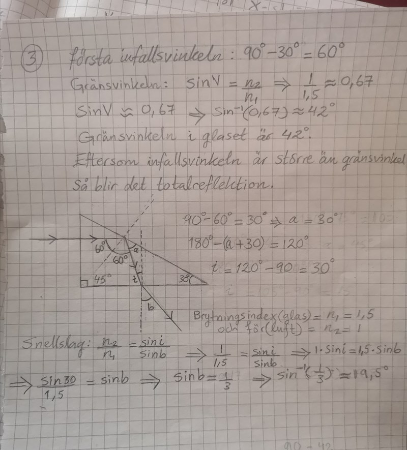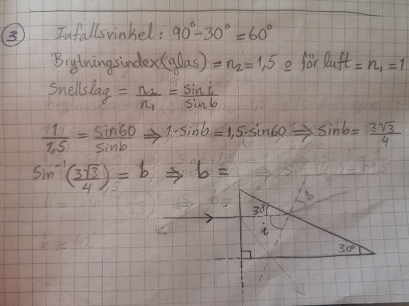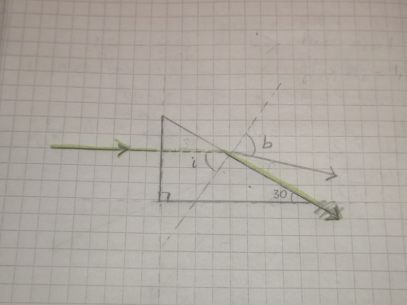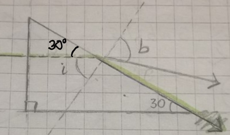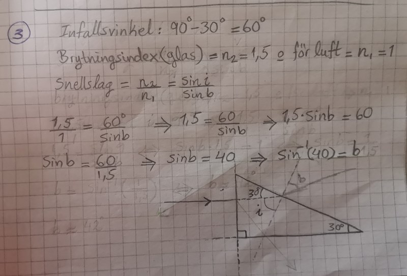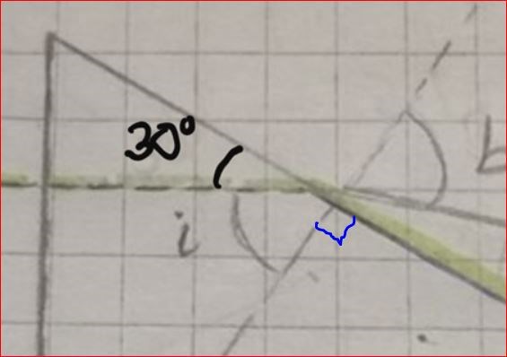 Ser nu att du har fått ihop geometrin och korrekt kommit fram till att infallsvinkeln mot prismats nedre begränsningsyta är 30°.