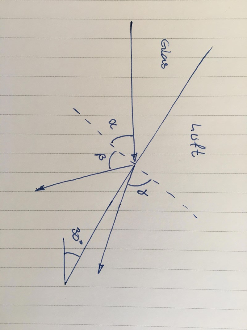 Jag hittat bild som visar det hela. Jag har ritat allt nu och försöker hitta vinkel a för att vidare hitta andra infallsvinkeln, jag vet att jag bör använda geometrin här men hittar inte vägen..